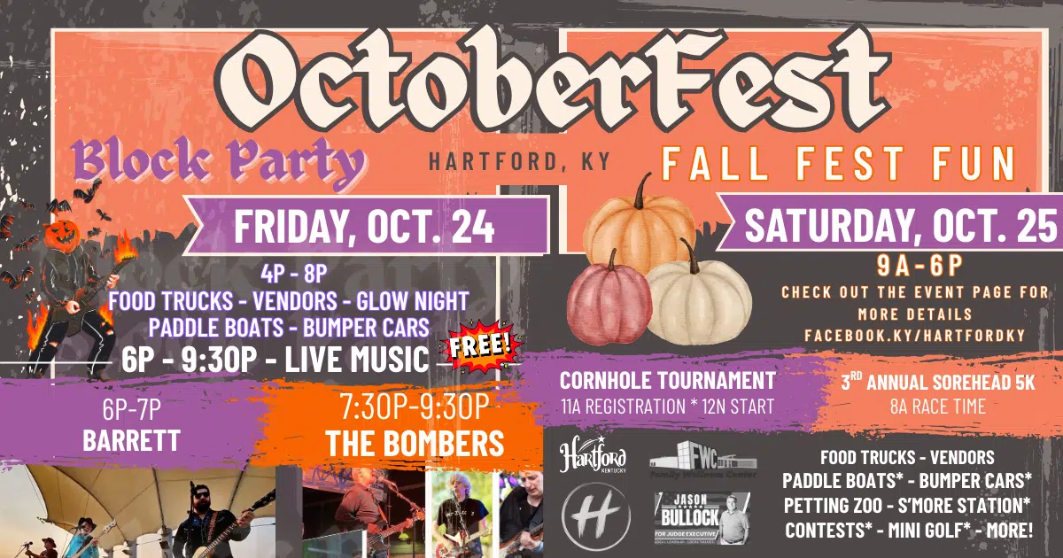 Hartford, KY — Sept. 15, 2025 — The City of Hartford is excited to announce OctoberFest 2025, a two-day community celebration that blends the energy of Hartford fall traditions. The event takes place Friday, October 24, and Saturday, October 25 in downtown Hartford, offering something for all ages.